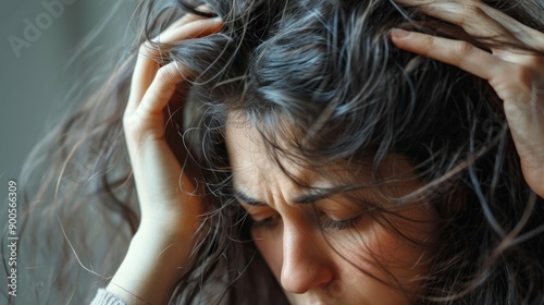 © Polpimol, Obraz premium woman very sad and upset looking at damaged hair, hair loss, hair thinning problem, vitamin deficiency, baldness, postpartum, biotin, zinc, menstrual or endocrine disorders, hormonal imbalance