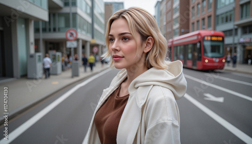 © Iryna, Fototapeta premium Woman waiting at tram stop in urban street, spring tourism launch