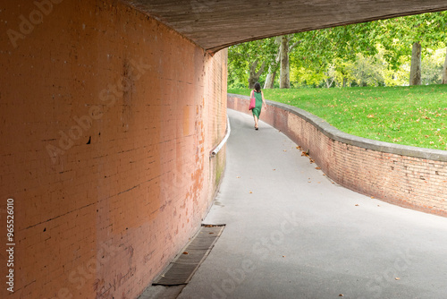 © Néstor MN, Obraz premium Woman walking along pedestrian walkway. Pamplona, ​​Navarra