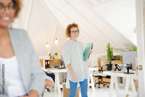 © KOTO, Fototapeta premium Woman walking and carrying laptop, joining colleague from office
