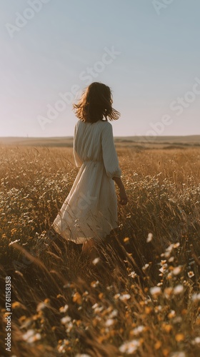 © Adi, Naklejka premium Woman walking dreamily through golden flower field