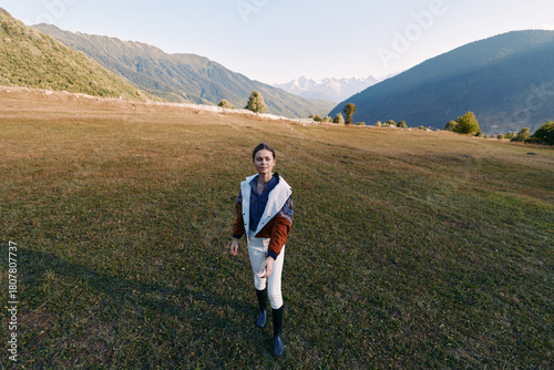 Fototapeta premium Woman walking in a meadow with mountains and expansive landscape, nature...