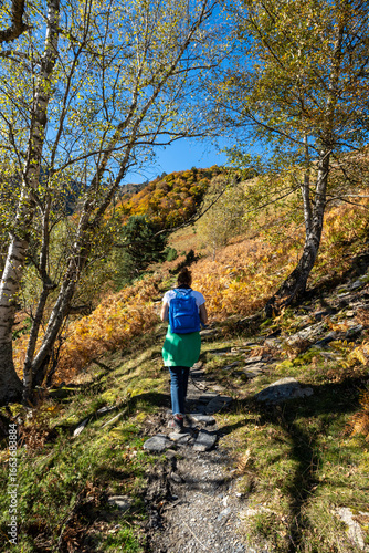 Naklejka premium Woman walking in the woods in autumn. Pyrenees, France. Shooting from the back.