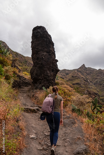 © Chris, Naklejka premium Woman walking next to massive rock formation wall in the Canyon Barranco de Afur, Anaga park, Tenerife, Canary Islands, Spain, Europe. Panoramic hiking trail from Afur to Taganana in Anaga massif