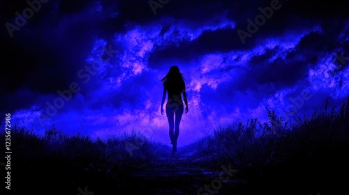 © DZIKRA , Fototapeta premium Woman walking night field stormy sky hope mystery