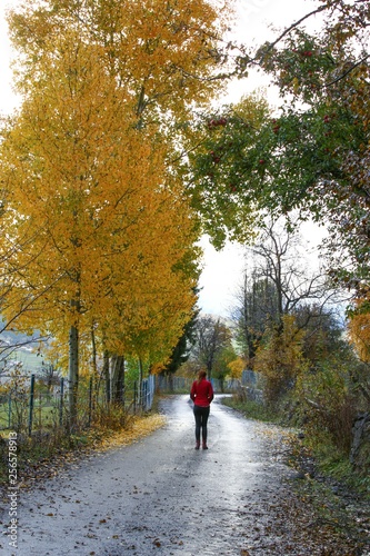 © murat, Fototapeta premium Woman walking on misty autumn forest road .turkey