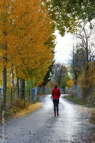 © murat, Fototapeta premium Woman walking on misty autumn forest road .turkey