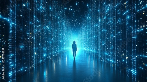 Fototapeta premium Woman Walking Through Digital Corridor: A Journey into the Metaverse