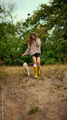 Naklejka premium Woman walking with dog in yellow boots on forest trail. Concept of outdoor lifestyle, autumn fashion, pet companionship, joy, and healthy leisure in nature.