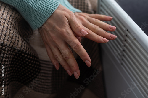 © Angelov, Obraz premium Woman warming hands near heater indoors, closeup