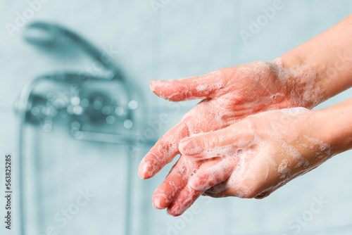 Fototapeta premium Woman washes her hands with foam soap