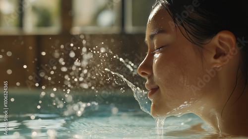 Obraz premium Woman washing face, A woman splashes water onto her face in a spa-like...