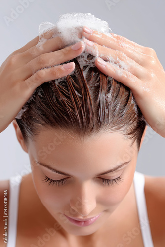 Naklejka premium Woman washing her hair with lather, showing healthy scalp and strands