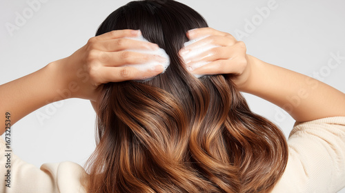 Naklejka premium Woman washing long brown hair with shampoo foam. Healthy haircare routine showing scalp massage and cleansing treatment. Beautiful wavy hair with highlights during salon-quality wash.