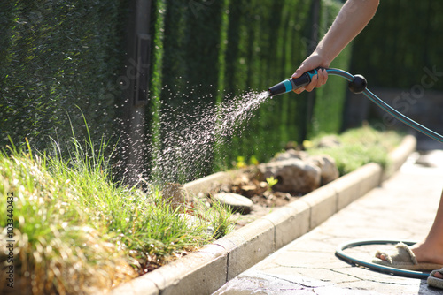 © Antonioguillem, Naklejka premium Woman watering plants with water shortage in the garden