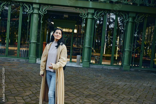 Naklejka premium Woman wearing a long beige coat stands outdoors in front of green glass...