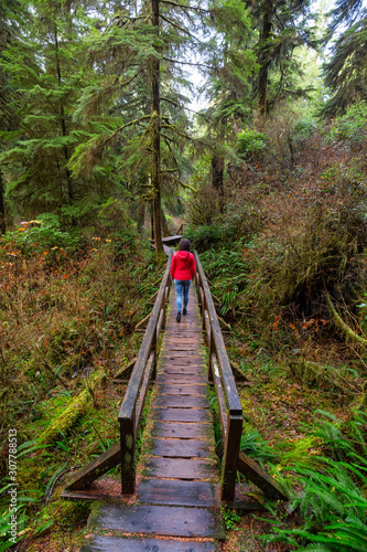© edb3_16, Fototapeta premium Woman wearing a red coat walking on a wooden path in a wild forest. Taken in Rainforest Trail, near Tofino and Ucluelet, Vancouver Island, BC, Canada.