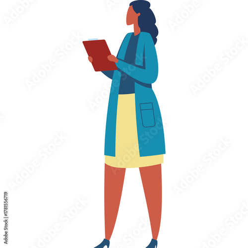 © FebiolaArdilla, Obraz premium Woman Wearing A Teal Blue Coat Over A Dark Blue Top And A Yellow Skirt Holding A Red Folder In Front Of A Transparent Background