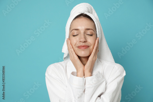 © New Africa, Obraz premium Woman wearing bathrobe with hair wrapped in towel on light blue background