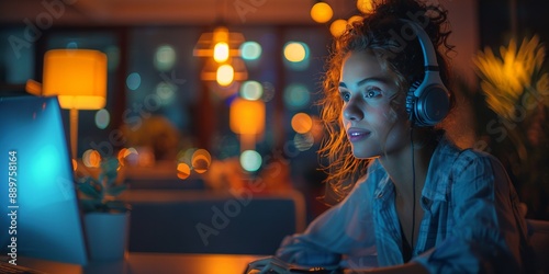Fototapeta premium Woman wearing headphones, working late at night on a computer in a cozy, dimly lit room with warm ambient lights