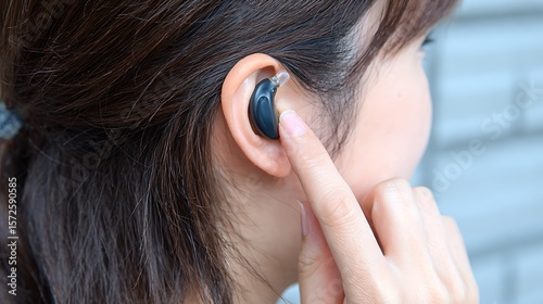 © Adib, Naklejka premium Woman wearing hearing aid for better hearing in her ear shows healthcare and improved quality of life with hearing technology.