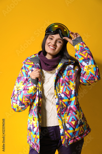 Fototapeta premium Woman wearing stylish winter sport clothes on yellow background