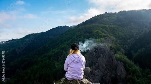 © MICKAEL, Naklejka premium woman who smoke on a mountain