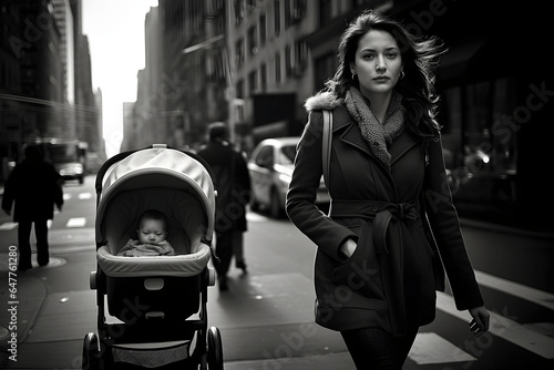 Fototapeta premium Woman with a baby carry in a big city, baby, city, big city, street, streetphotography