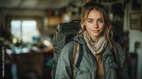 © kramynina, Fototapeta premium Woman with a backpack in a room with a window travel concept copy space