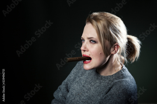 © Олеся Кузина, Obraz premium Woman with a cigar. The beautiful blonde. Black background