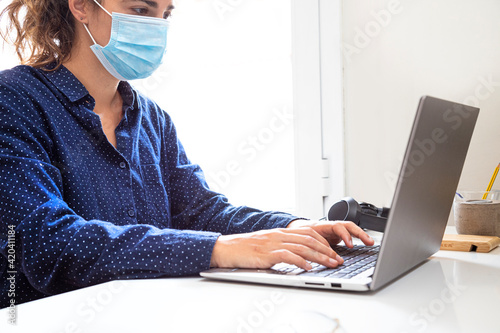 © Daniel, Naklejka premium woman with a mask working with her laptop in a bright office