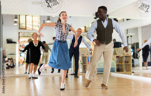 Fototapeta premium Woman with african man practising charleston dancing