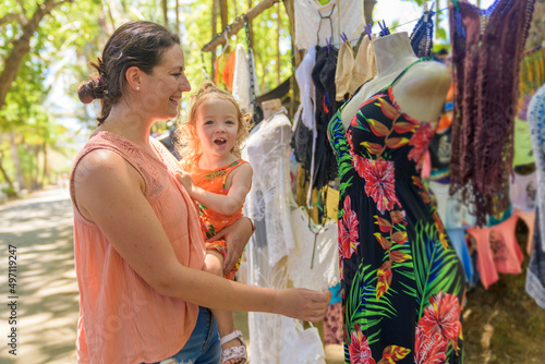© Louis-Paul Photo, Obraz premium woman with baby shopping outdoors at typical traditional market