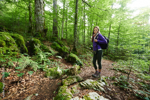 © Xalanx, Fototapeta premium Woman with backpack hiking into the forest