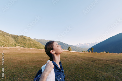 © SHOTPRIME STUDIO, Fototapeta premium Woman with backpack in mountain meadow enjoying fresh air and nature, hiking and travel portrait with closed eyes, peaceful scenic landscape and relaxed outdoor adventure.