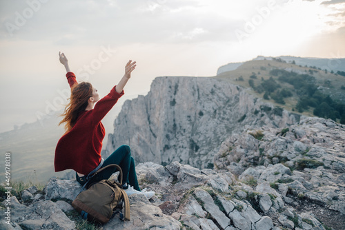 © VICHIZH, Obraz premium woman with backpack in mountains at altitude landscape nature