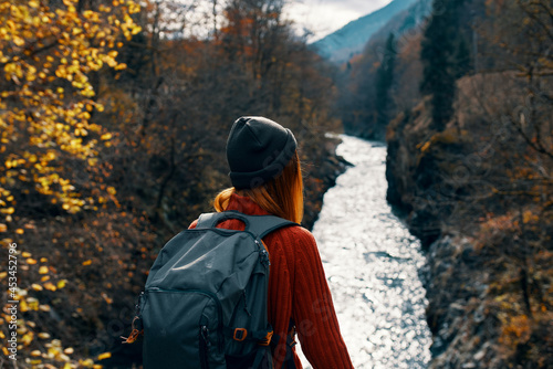 Naklejka premium woman with backpack on her back river mountains nature travel