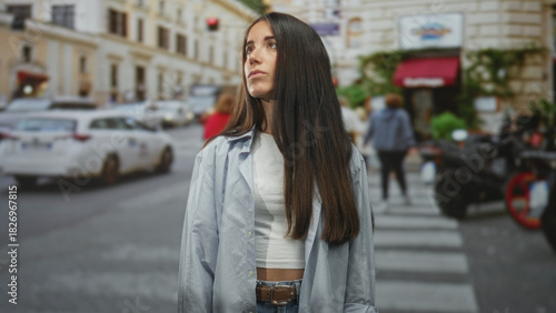 © Krakenimages.com, Fototapeta premium Woman with bare midriff and long hair, standing with eyes closed and head tilted up on a street; serenity introspection.
