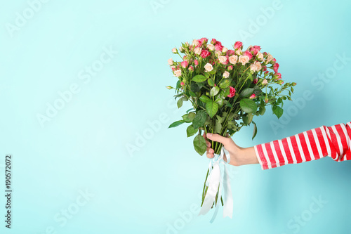 Fototapeta premium Woman with beautiful bouquet of roses on color background