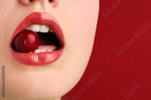 © New Africa, Obraz premium Woman with beautiful lips makeup and cherry on red background, closeup. Space for text