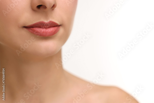 Obraz premium Woman with beautiful lips on white background, closeup. Space for text