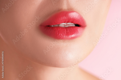 Fototapeta premium Woman with beautiful lipstick on her lips against pink background, macro view