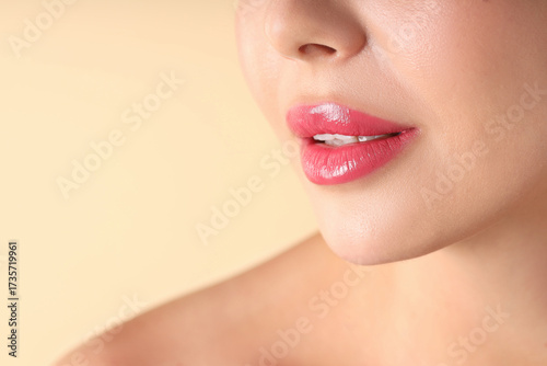 © New Africa, Obraz premium Woman with beautiful pink lipstick on her lips against beige background, macro view. Space for text