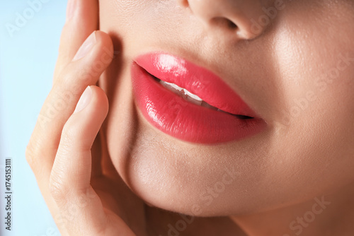 © New Africa, Obraz premium Woman with beautiful pink lipstick on her lips against light blue background, macro view