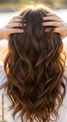 Obraz premium Woman with beautiful, wavy brown hair, enjoying the warm sunlight on her head, outdoors.