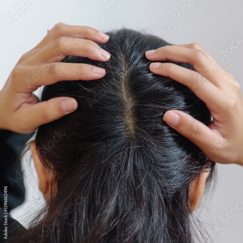 Obraz premium Woman with black hair massaging her scalp.