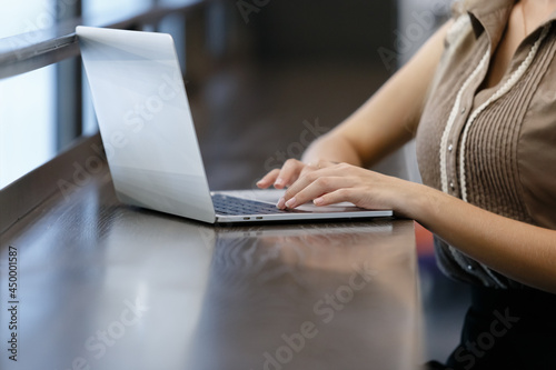 Fototapeta premium Woman with blond hair using with computer laptop at office table....
