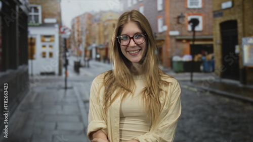 Fototapeta premium Woman with blonde hair and eyeglasses covers her eyes with hands while standing on wet urban street; playfulness.