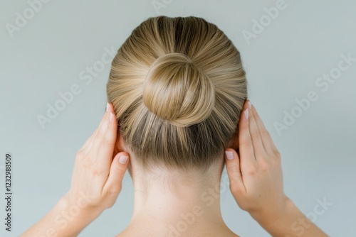 Fototapeta premium woman with blonde hair in a neat bun hairstyle, holding her head