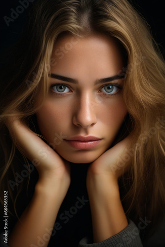 © VISUAL BACKGROUND, Fototapeta premium Woman with blue eyes and long hair is posing for picture.